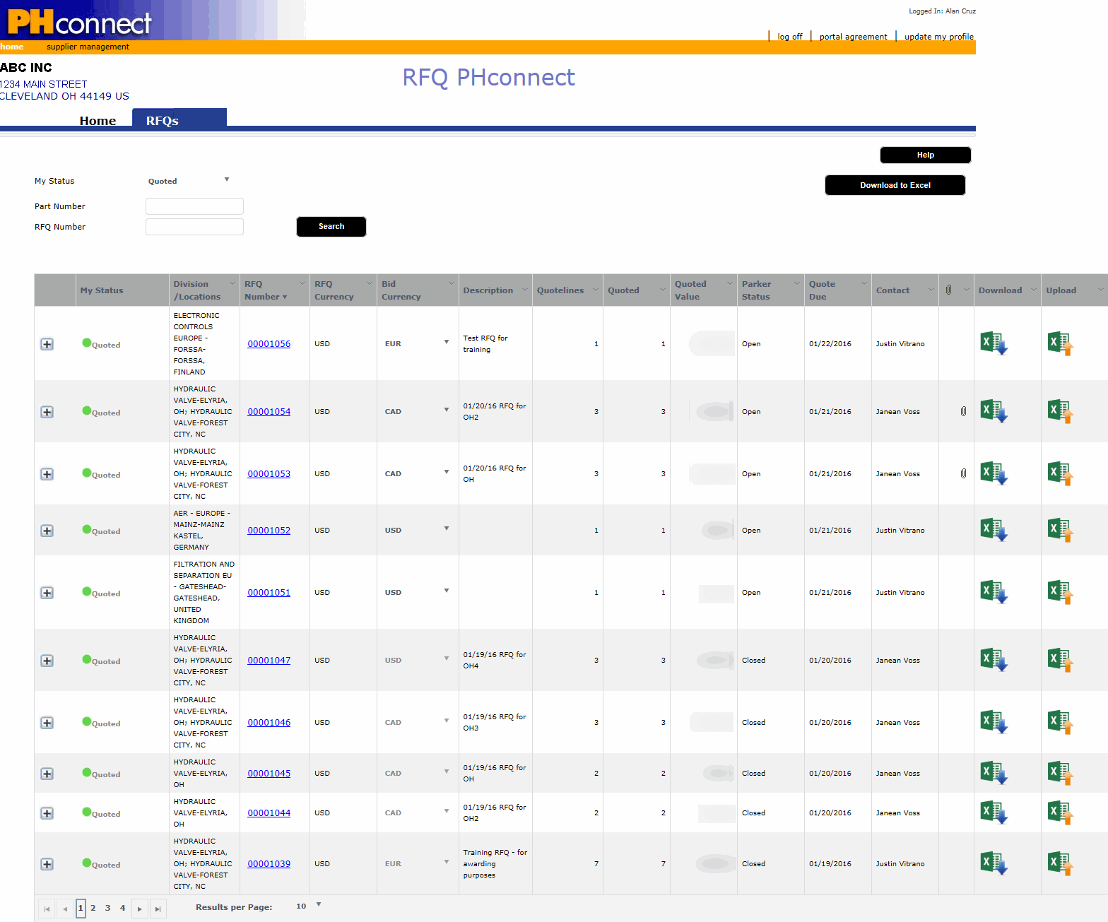 Click Download to Excel if you want to review the content on the RFQ List screen in Excel.